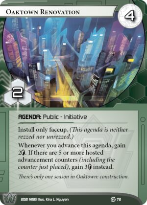 わざわざ《Oaktown Renovation》を計画書に選んでいるのもランナーに得点行動がバレることを前提としているため。公共/Publicな計画書は表向きにインストールされるがその分効果は強め。クレジットを稼ぐという目的なら《Offworld Office》よりわずかに効率がよく、しかもアドバンスと同時にクレジットを得られるので隙を生じにくい。