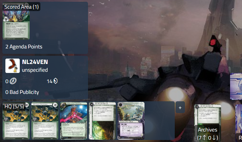 ここであと1枚計画書を得点すれば勝利だがクレジットは残り2。こんな心許ない額じゃHQにある《SDS Drone Deployment》の得点を仕掛けることはできない。