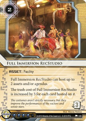 《Full Immersion RecStudio》の上には計画書もしくは資材を2つまでインストールできる。1つのサーバーに2つ以上の計画書や資材が同居できないのがこのゲームの常だが、このカードはそのルールを破壊する。
