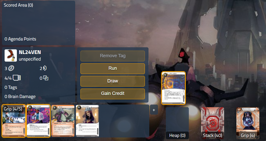 ランナーに《Space Camp》を複数回踏ませてICEを育てる魂胆もあったが、その企みは今回機能不全に終わった。《Space Camp》を活用できるIDはこれではないと感じたので、もっと良いパートナーを他に探してみようと思う。