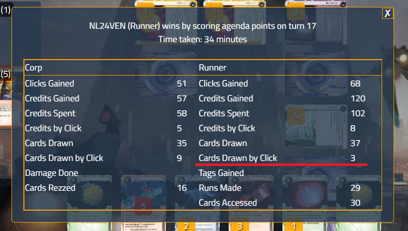 クレジットを絞る作戦は上手く機能し、ランナーの財布はズタズタに。しかし最後の1点が取れず逆転負け。《K2CP Turbine》のおかげでどのサーバーも2~3クレジットで突破されてしまうので、《Endurance》をトラッシュしても状況を改善できなかった。《Retribution》の2枚目があれば……。
