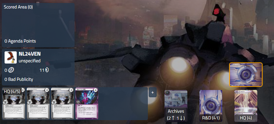 計画書を得点したことにより、事前に遠隔サーバーに仕込んでおいた《Malapert Data Vault》でR&Dからカードをサーチ。《Jinja City Grid》をHQに加える。この調子で必要なパーツを集めていこう。