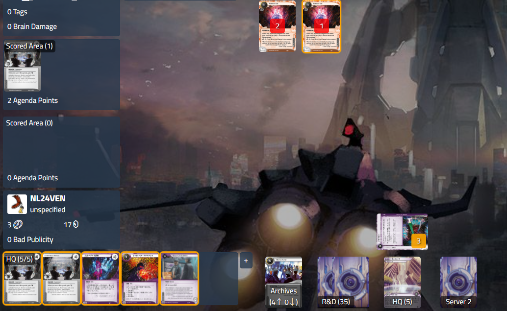 1アドバンスしておかなければ次のターンに得点できないが、ここまで遠隔サーバーが育ったあとであればHQに握っておくよりも安全な気がした。