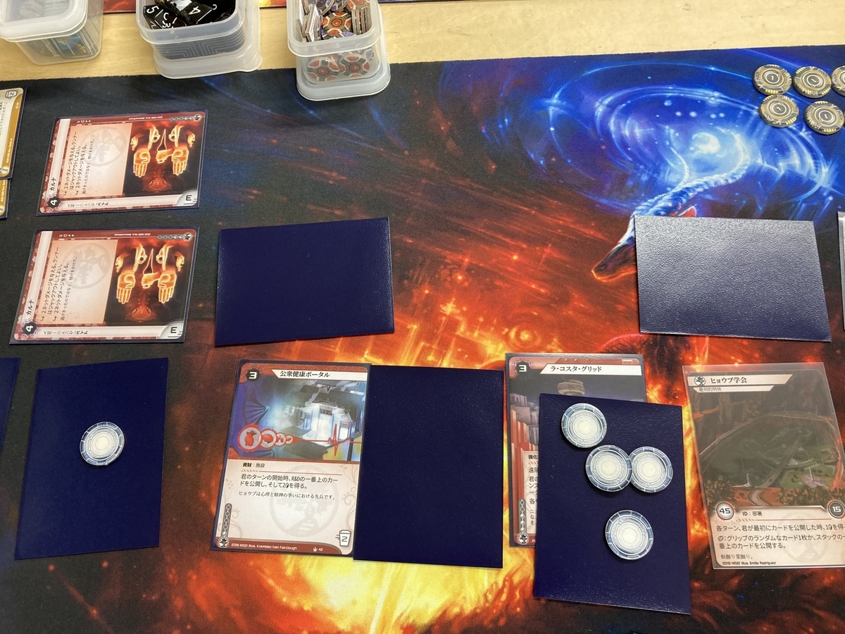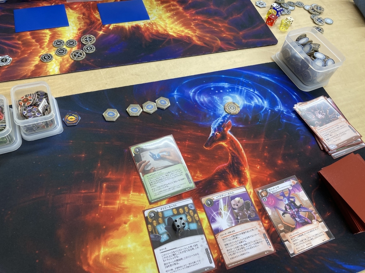 資材を横に並べてドローしつつ展開を進めるものの、《Aumakua》にカウンターをがっつり稼ぐことを許してしまった。インストールしたカードを逐一チェックされるとなかなか得点しずらい。