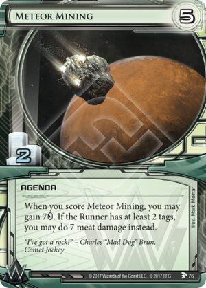 Weyland Consotiumの土地開発は地上のみならず宇宙にも及んでいる。Red Sandサイクルは火星開発をテーマにした小拡張群であるが、その中に収録されている《Meteor Mining》はクレイジーそのもの。