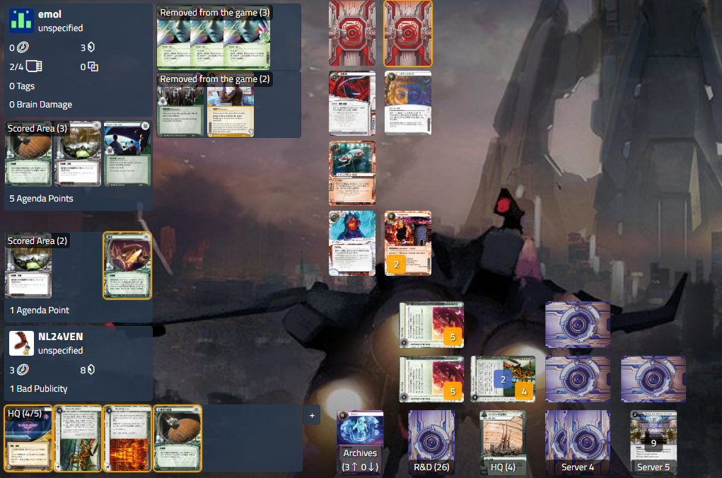 計画書がHQに溢れまくって地獄絵図…。しかも《Moon Pool》をちょうどR&Dのトップからトラッシュされてリカバリー不能に。計画書しかないHQを攻められるたび、ピンポイントで盗まれたかのようなリアクションして頑張って誤魔化しなんとか耐えるも、次のターン得点して勝ち!というところで《Finality》でR&Dから盗まれて負け。