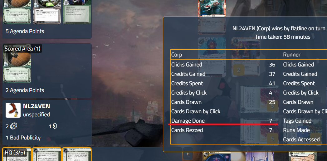 その後抵抗虚しく《Funhouse》はトラッシュされてしまったものの、アーカイブにまとめて捨てられていた《Space Camp》にランナーがアクセス。インストールされていた《False Flag》にがっつりとアドバンスカウンターが載る。